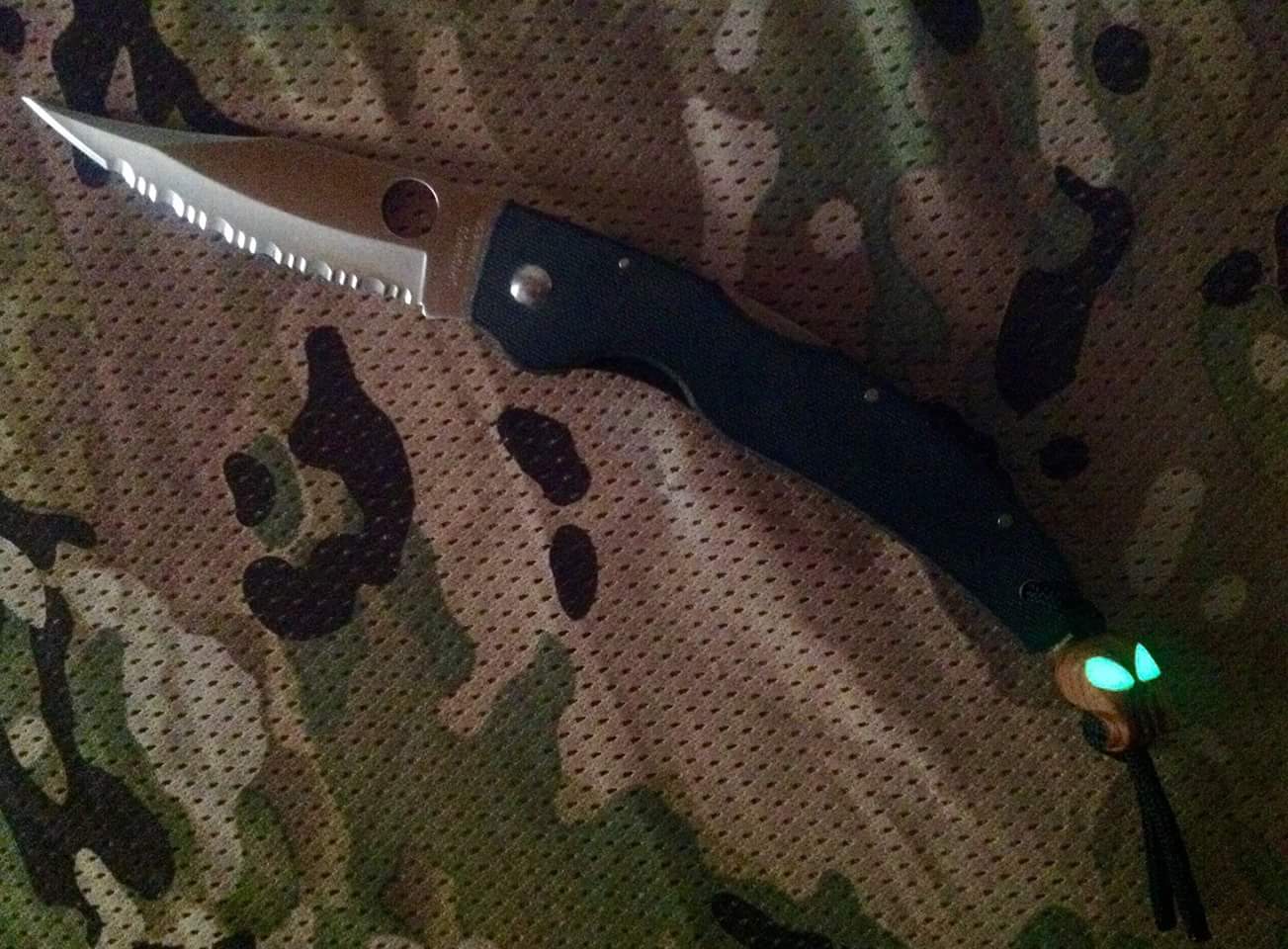 Ancient Olive Wood Design Skull with GitD Eyes for my co-friend's rare Spyderco Gin-1 Blackhawk(?), gift from Mossad agent.